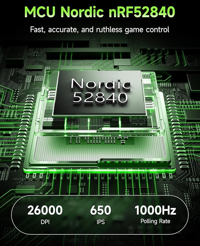 - PRO-GRADE PAW 3395 SENSOR + NORDIC CHIP – Up to 26,000 DPI, 650 IPS, 1000Hz polling. Lightning-fast tracking and ultra-low latency powered by the reliable NRF52840 chipset.