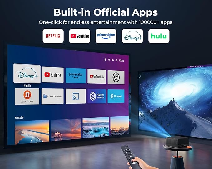 - 【Netflix, Prime Video and YouTube Built-in】Enjoy direct access to licensed apps like Netflix, Amazon Prime Video, and YouTube with the built-in "App Store." No need for extra devices or complicated setups! Plus, with dedicated buttons on the remote, you can instantly launch your favorite streaming platforms for a hassle-free movie night.