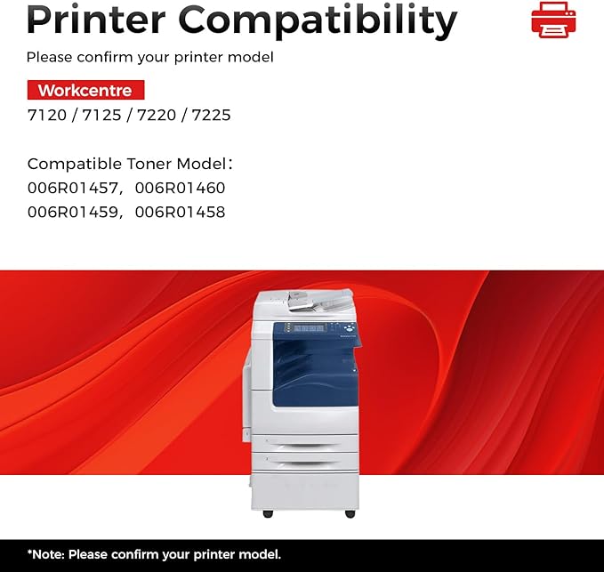 - Compatible Printer: Compatible with Xerox WorkCentre 7120, Xerox WorkCentre 7125 7220 7225; Compatible Toner Model:006R01457,006R01460,006R01459,006R01458