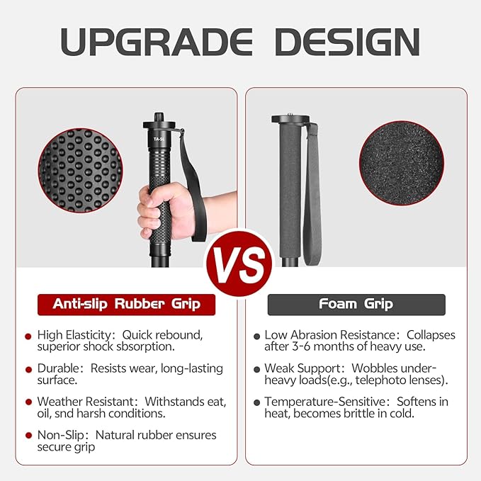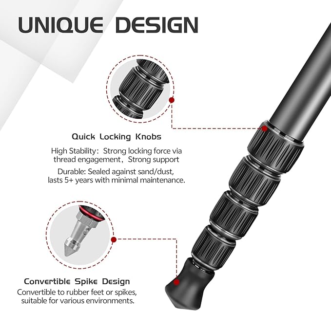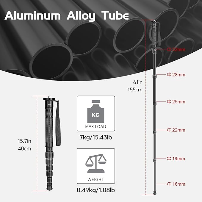 - 【Compact& Durable Design】:Crafted from lightweight aluminum, this 61" camera monopod weighs just 1.1 lbs/0.5kg yet supports up to 16 lbs/7kg, collapsed to just 15.7 inches, fitting easily into camera bags or backpacks.Making it ideal for travel photography with DSLR cameras (Canon, Nikon, Sony) without sacrificing stability.