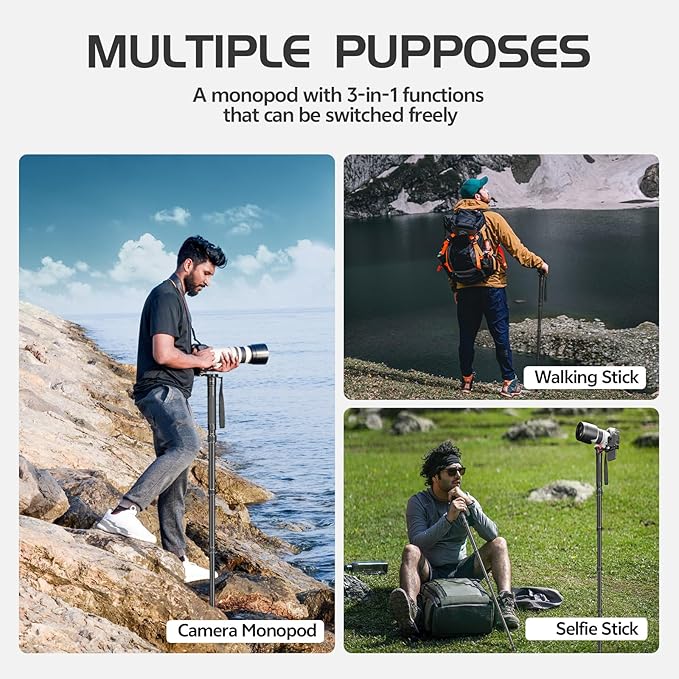 - 【3-in-1 Functionality】:Triples as a monopod for camera,selfie stick and hiking walking stick! The wrist strap and ergonomic grip provide balance for rugged terrain, while the rubber foot ensures stability on any surface.