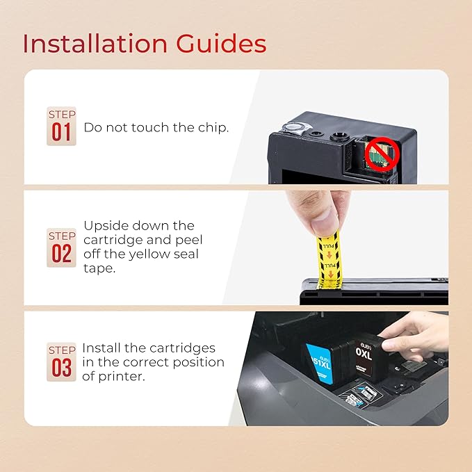 - Installation steps: STEP1 Remove the yellow tap. STEP2 Install the cartridge into corresponding slot. Tip: Do not touch the chip and squeeze the sides of the cartridges.