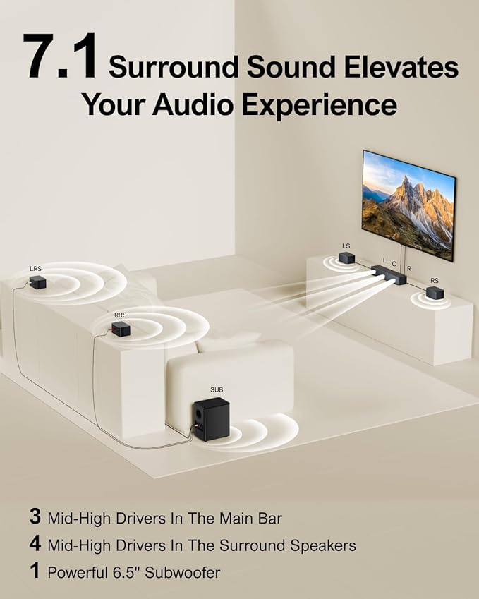 - 7.1ch Virtual Surround Sound System: Evolved from the 5.1ch Poseidon D50, the Poseidon D70 offers an upgraded 7.1-channel virtual surround system for a more immersive experience. Three front channels deliver crystal-clear dialogue, supported by 4 wired surround speakers and a 6.5" wireless subwoofer that expand the soundstage. (Please note: Dolby Audio/Atmos not supported.)