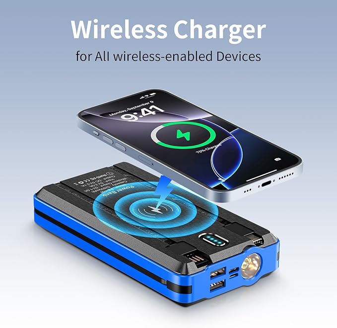 - 【Built-in cable and charging】: The power bank itself carries 3 output cables for Apple, Android, type-c, and one USB input cable. It also provides 2 USB output ports and 2 input ports (type-c and Android), which can be 5 at the same time. In addition, it also provides a wireless charging function, just put the mobile phone with wireless function on the back, and lightly press the power button to use it. Really one machine with multiple functions, fully satisfying daily life use.