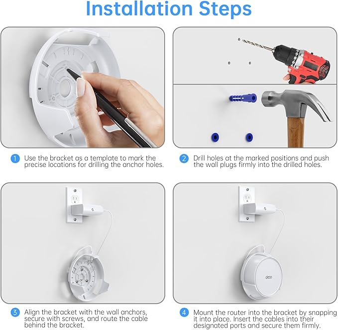 - Space-Saving & Secure Installation: Securely mount your Deco Mesh WiFi 7 System on the wall or ceiling, protecting it from spills, pets, or accidental bumps. Perfect for small spaces or areas with limited room, ideal for home, hotel, or office use