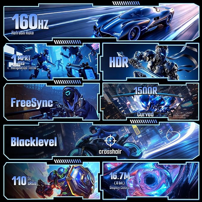 - Smooth Gaming: Up to 160Hz Refresh Rate, MPRT 1ms Response Time, Freesync Compatibility. Black level Adjustment, Crosshair, Game Timer, Various Game Modes( FPS/RTS/MOVIE/STANDARD)