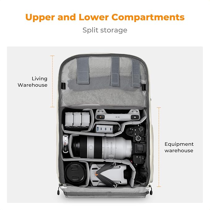 - 【Large Capacity】17.32 x 11.81 x 6.69 inches, approx. 20L; The main compartment holds 1 Camera + 4 Lenses + tripod + other photography accessories, or for DJI Mavic Drone (Mavic 2/Air/Pro) storage; The upper compartment is optimized to store and protect personal items (such as clothes, wallet, cell phone or flash drive); The tripod can be fixed at front: The edition includes a self-contained laptop compartment for up to 15.6-inch laptops.