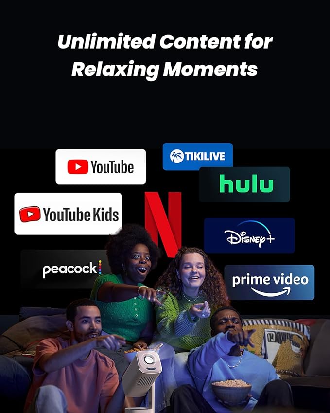 - 【Licensed Streaming Apps Built-In】Enjoy your favourite shows the moment you power on. The Yaber T1 Pro mini projector with WiFi and Bluetooth comes with a built-in Smart TV operating system, offering officially certified Netfx, Prime Video, YouTube and more. With just a click on the remote, you can play your facourites movies and shows. Perfect for a movie night in the living room, a bedtime cartoon for kids, or a weekend sports match.Regularly updated by our professional team to ensure stable performance, and secure viewing.(Not including HBOmax/Apple TV)
