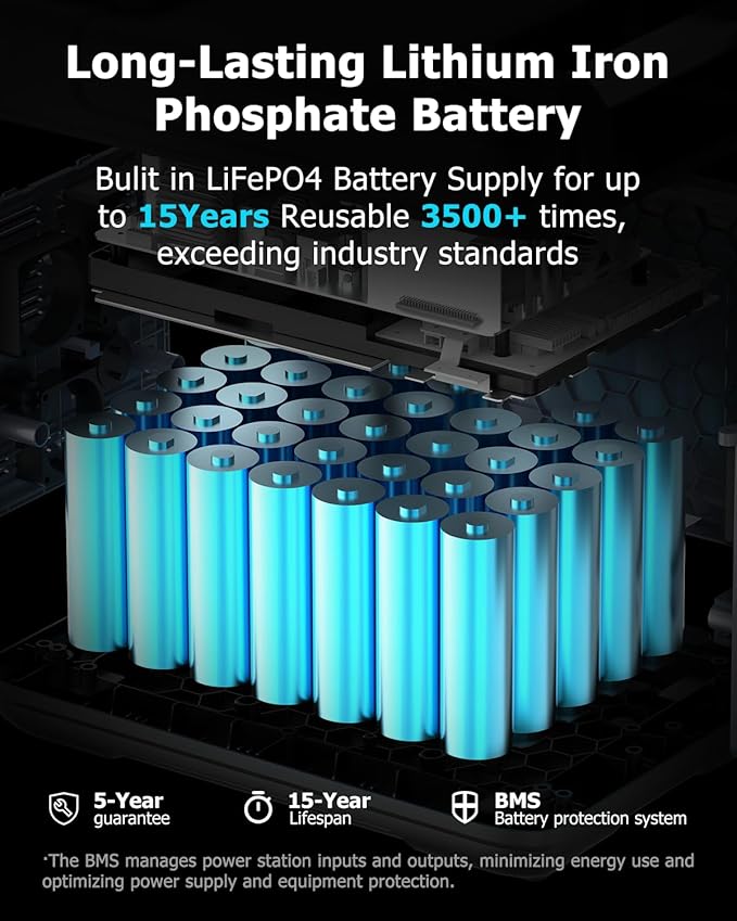 - [Uses high-quality LiFePO4 battery] The built-in battery uses a lithium iron phosphate battery (LiFePO4) that lasts 15 years with over 3500 charge/discharge cycles. It lasts seven times longer than conventional batteries and costs less. It also has a battery management system (BMS) and control unit (MCU) to manage battery cell voltage and temperature.