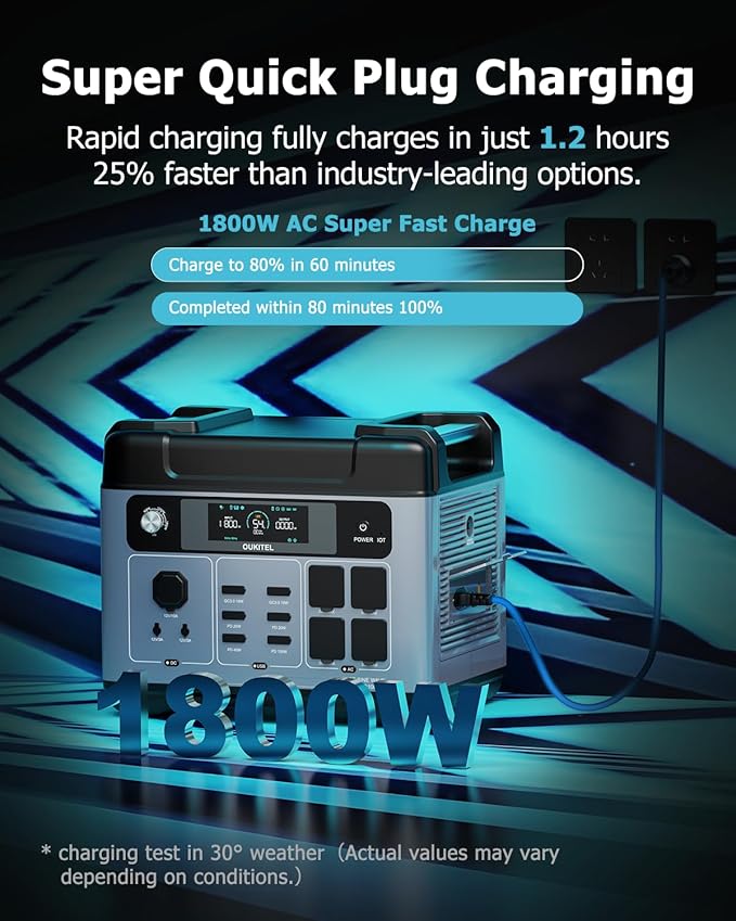 - [Recharge in a Rush] With 1800W AC charging, achieve 80% battery capacity in just 1 hour and a full charge in 1.5 hours. Combine solar and AC input up to 2300W to achieve 80% battery capacity in just 50 minutes and a full charge in 80 minutes.
