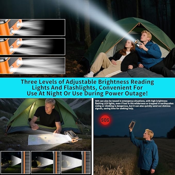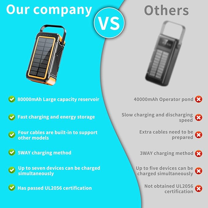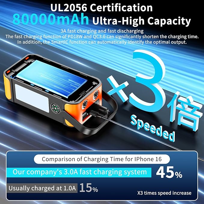 - 【Solar Panel Perfect for Outdoor Enthusiasts】80000mAh Solar Power Bank Super Large Capacity.Let You Get Rid of The Anxiety About Battery Electricity Anytime,Anywhere. Built-in 2 LED Flashlights with 3 Modes (lighting/ flashing/ SOS), Which Can Be Used As Camping Lamp, Emergency Lamp And Rescue Signal Lamp. Equipped with Solar Panel, Just Hang It on Your Backpack to Get Recharge via Sunlight. It's Perfect for Outdoor Activities, Like Camping, Hiking And Other Emergencies.