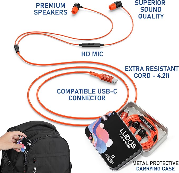- BUILT FOR HOURS OF COMFORTABLE WEARING β These USB C headphone feature rock solid design and a extra long 4.2 ft cord; earphones wired with mics are designed to be super tough and withstand the most demanding conditions; When you need wired ear buds for performance, trust only LUDOS