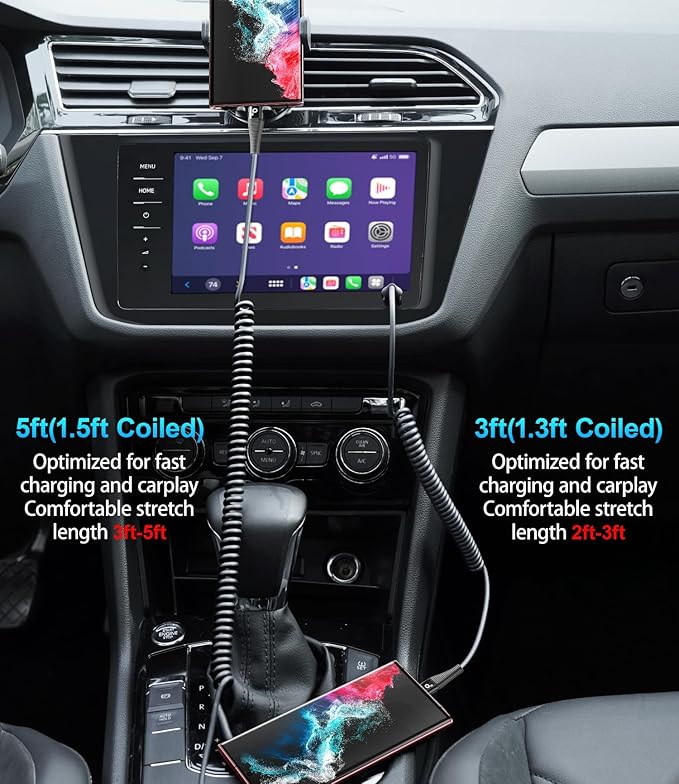 - USB C Cable Made for Car: The USBC car charger cable is designed with stretchable, no tangle, no knot, and does not take up space. This coiled USB-C to USB-Ccharging cable is made of upgraded high quality PU material, which is flexible, easy to stretch, effortless, quick to rebound and not easily deformed.
