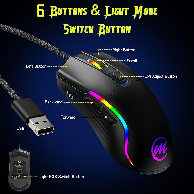 memzuoix Wired Gaming Mouse with RGB - 6 Adjustable DPI up to 12800, 6 Buttons, 12 Lighting Modes, Ergonomic Design with Anti-Slip Rubber Wheel, 5.6ft Braided Cable for PC/Mac/Windows - Black