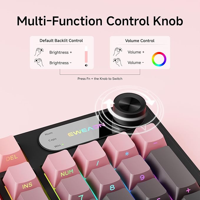 - Dedicated Knob & Display Screen: Equipped with a smart rotary knob, this wired membrane keyboard allows effortless control: toggle between backlight modes with a single press, adjust brightness by rotating the knob, or hold FN + knob to switch to multimedia mode for volume control and mute. The built-in display shows the EWEADN logo and real-time status like Caps Lock, Num Lock, and Win Lock—keeping you informed without any software