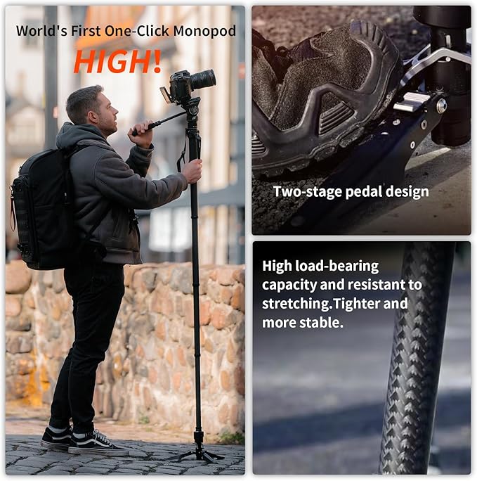 - 【Stable Support Feet & Ergonomic Foot Control】 The monopod camera stand reinforced 600g steel foot supports (190mm length) provide a solid base on uneven terrain. A two-stage foot-release mechanism adds ease and control, allowing rapid adjustments with a simple press