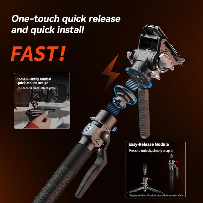 - 【One-Click, Four-Section Monopod】 COMAN Go! M1 series monopod equipped with one-click lifting system and an innovative four-section carbon fiber leg. The M1Pro V5 monopod offers unmatched convenience in height adjustment, with just one press, extend or retract your monopod instantly, boosting setup speed by up to 300% compared to traditional designs