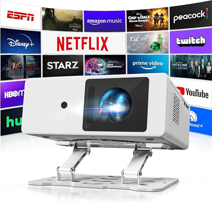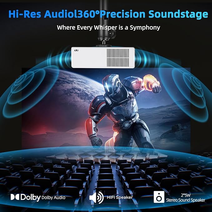 - 【Travel-Ready Design with 360°Projection & Premium Audio】Weighing just 3.75 lbs, this compact yet powerful bluetooth projector is ready to go wherever you are—indoors or out. The adjustable stand offers true 360°projection, and the built-in 5W high-fidelity speaker pumps out rich, immersive sound without needing external devices. From camping trips to backyard movie nights, this proyector 4K ultra HD brings theater-quality viewing to any space, powered by lightning-fast WiFi 6 and Bluetooth for smooth streaming