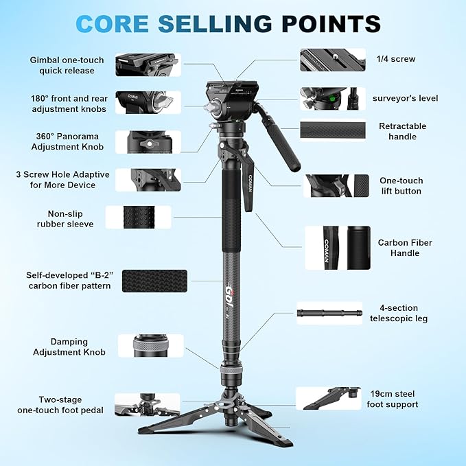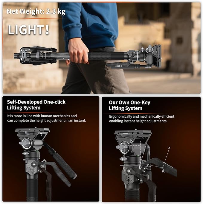 - 【Premium B-2 Carbon Fiber Tube】Crafted from high-grade B-2 carbon fiber tubes with graduated diameters (36/32.5/29/25.5mm), The COMAN M1 monopod delivers exceptional strength while maintaining an ultra-lightweight feel—ideal for demanding outdoor shoots and long hours of handheld use