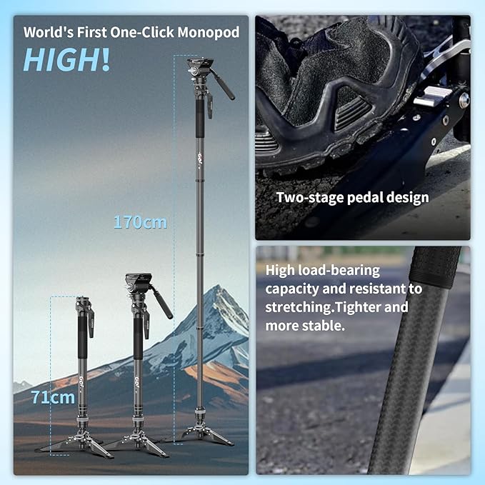 - 【New V5 Hydraulic Fluid Head】 The carbon fiber camera monopod with professional-grade V5 hydraulic head allows ±90° tilt and 360° panning for precise framing. Whether you're tracking wildlife or capturing cinematic footage, enjoy fluid, stable movements with minimal effort