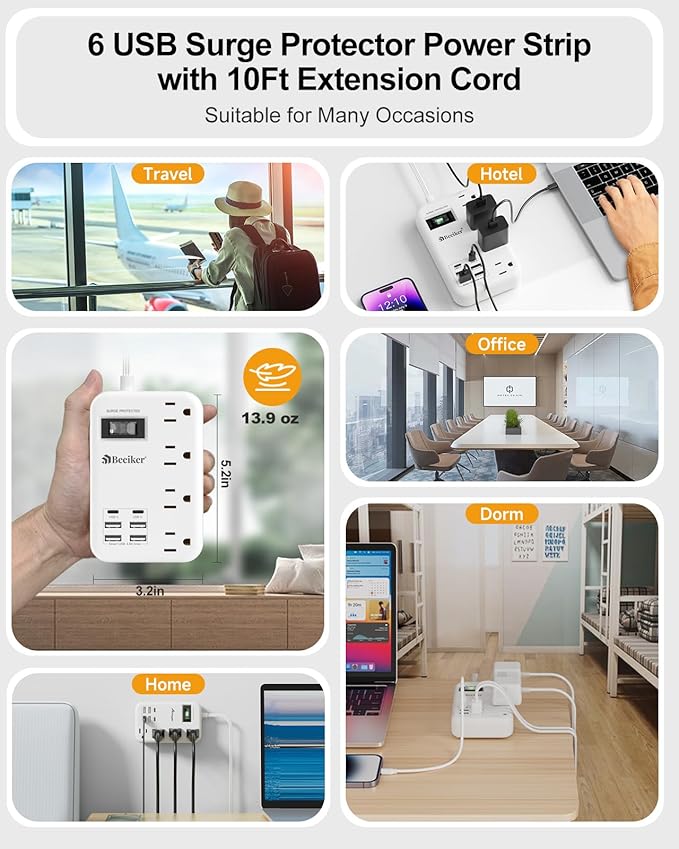 - 【Multiple Safety Protection USB Power Strip】The extension cord 10 ft is certified by FCC, and made of Fire-resistant PC shell, with built-in multiple security module safeguards your electronic devices from surge,short circuit,over-voltage and over-current. 980J Surge protection rating to keep your electronics and mobile devices protected from voltage spikes.Lighted on/off switch with integrated circuit breaker for overload protection of all outlets.(Beeiker provides 12-month replacement and 24h service)