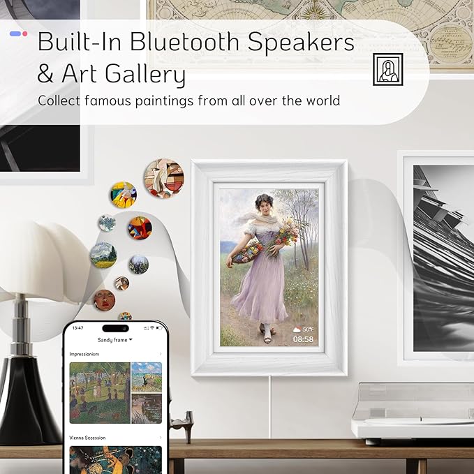 - 【Showcase Your Personal Gallery】NexFoto's Wifi-enabled electronic picture frame (compatible with 2.4GHz and 5Ghz) brings your art collection and photo album to life on your wall. You can easily explore a diverse range of visual art, including masterpieces and NFT art, while sharing life moments with loved ones from anywhere. The minimalist modern design enhances your home decor, and its wall-mounted design, provides a gallery-like viewing experience.