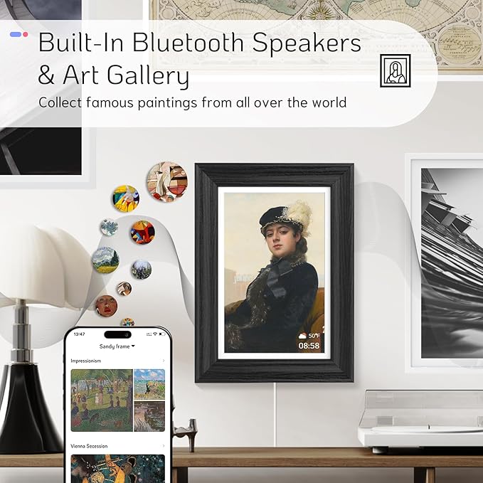 - 【Showcase Your Personal Gallery】NexFoto's Wifi-enabled electronic picture frame (compatible with 2.4GHz and 5Ghz) brings your art collection and photo album to life on your wall. You can easily explore a diverse range of visual art, including masterpieces and NFT art, while sharing life moments with loved ones from anywhere. The minimalist modern design enhances your home decor, and its wall-mounted design, provides a gallery-like viewing experience