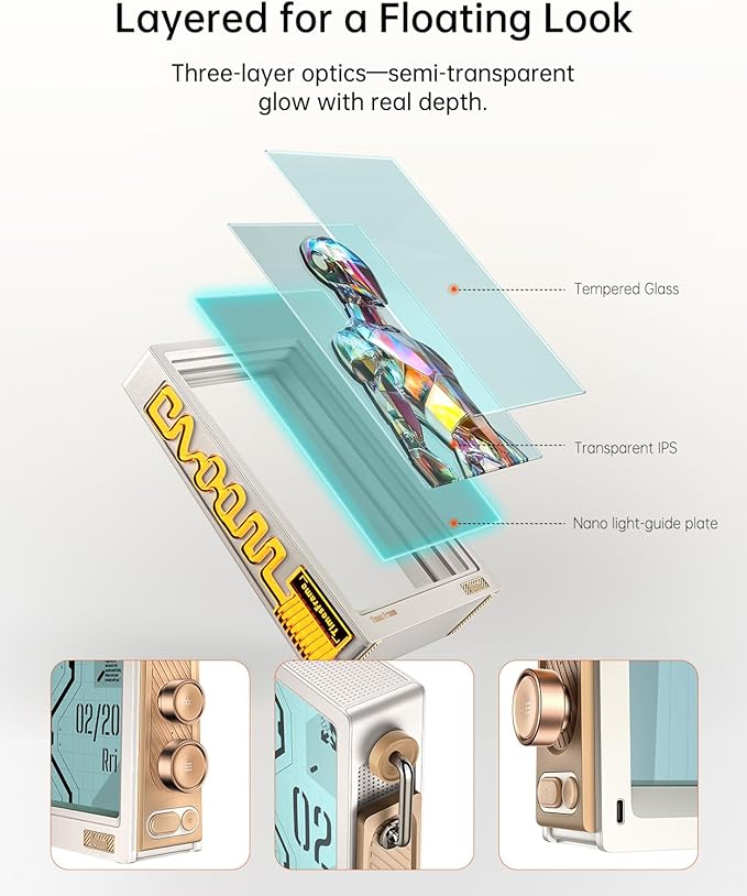 - Divoom Transparent IPS Digital Picture Frame:This transparent IPS digital picture frame also works as a sleek digital photo frame and futuristic electronic picture frame, delivering a semi-transparent,richer depth and 3D-like view unlike any traditional display. Beyond displaying memories, it's a lifestyle assistant with customizable clock faces, live weather, finance updates, and milestone reminders that elevate any space.