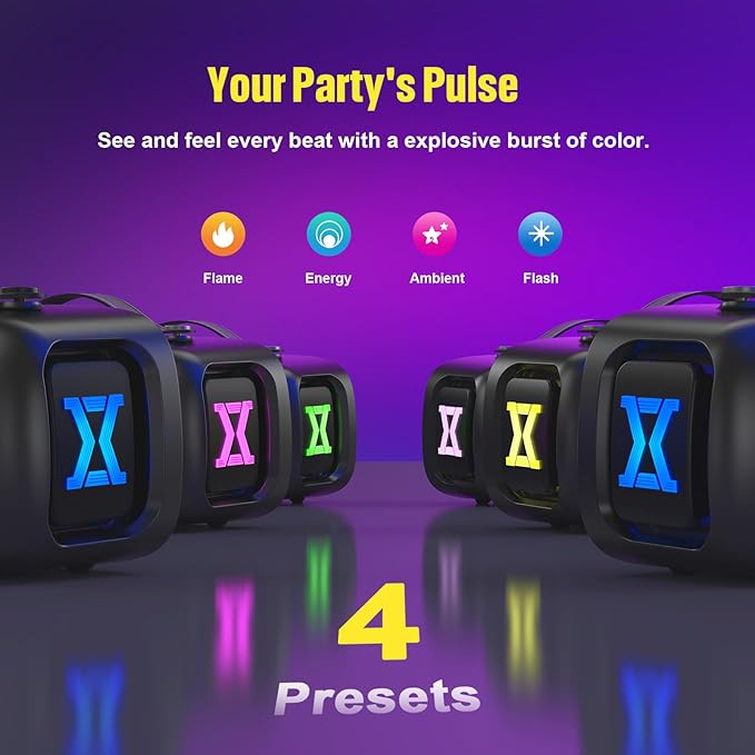 - Beat-Driven lights: Turn your party into an electrifying rave—the built-in LED lights lock onto every bass drop, pulsing and shining in perfect sync with the beat. Watch as colors explode in time with the music, transforming any room into an immersive visual spectacle that keeps the energy pumping all night long.