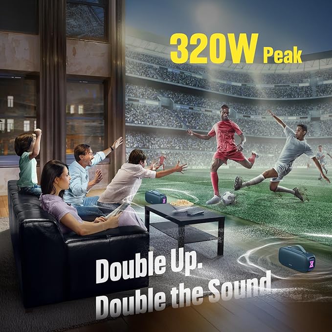 - 80W Powerful Sound (160Peak): Powered by a punchy 50W racetrack subwoofer, dual 15W tweeters, dual bass passive radiators, and advanced DSP technology, this acoustic beast delivers 80W(160W Peak) room-shaking bass, balanced mids, and crisp highs with virtually no distortion. From Sunday football to backyard pool parties, immerse yourself in rich, clean, immersive sound that fills every corner of your space.