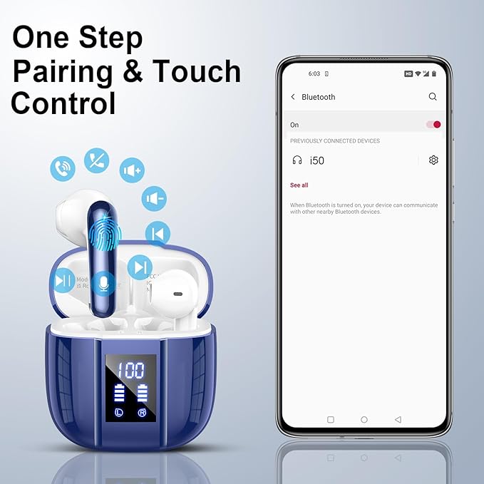 - IPX7 Waterproof & Intelligent Touch Control:With intuitive touch-sensitive controls, these wireless earbuds for Android let you manage playback, adjust volume, handle calls, and activate voice assistants directly from the earbuds—no phone needed. Built with IPX7-rated protection and advanced nano-coating technology, they effectively resist sweat and rain. Ideal for outdoor sports and demanding environments, these waterproof earbuds deliver reliable performance and clear sound anywhere.