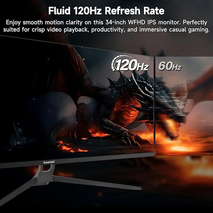 - Seamless Gaming - Immerse yourself in crystal-clear visuals with a 34-inch IPS panel and 2560x1080P resolution for stunning color accuracy and 128% sRGB coverage, Smooth 120Hz refresh rate ensures fluid motion and reduces screen tearing during fast-paced gaming sessions