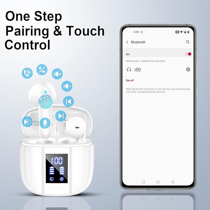 - IPX7 Waterproof & Intelligent Touch Control:With intuitive touch-sensitive controls, these wireless earbuds for Android let you manage playback, adjust volume, handle calls, and activate voice assistants directly from the earbuds—no phone needed. Built with IPX7-rated protection and advanced nano-coating technology, they effectively resist sweat and rain. Ideal for outdoor sports and demanding environments, these waterproof earbuds deliver reliable performance and clear sound anywhere.