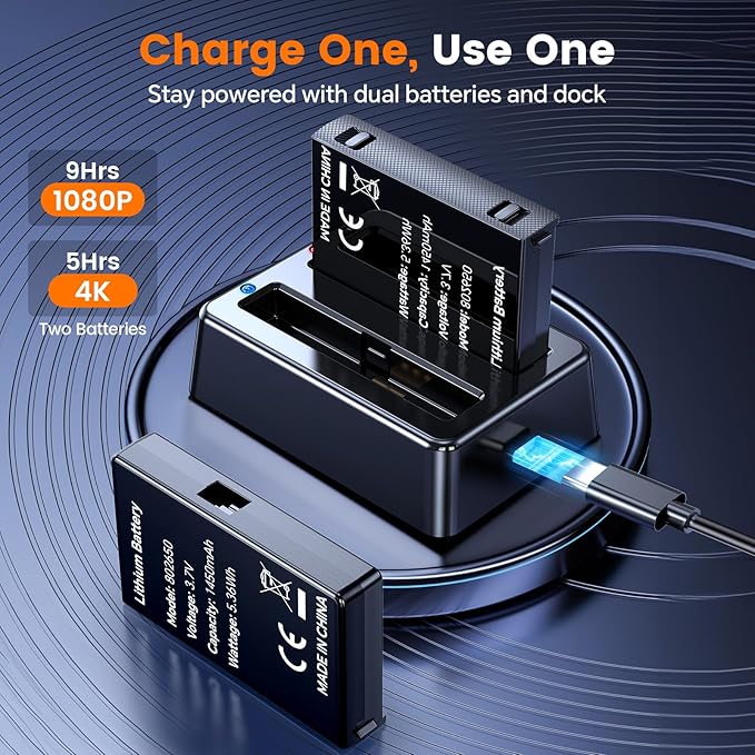 - Always Ready with Dual Batteries & Dock: Stay powered for longer. The small camera comes with two batteries and a dock—charge both at once, or swap instantly for non-stop 9Hrs video recording(1080P)