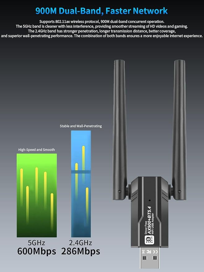 - 【Lightning Fast USB WiFi 6 Adapter】This WiFi adapter with bluetooth 5.4 supportsDual Band 2.4/5GHz, Dual-band concurrent rate up to 900Mbps (600Mbps@5GHz + 286Mbps@2.4GHz), 40% faster than traditional AC1300, Adopting the latest IEEE 802.11ax standar ensuring lag-free gaming, 4K streaming, and large file downloads 0 lagging.