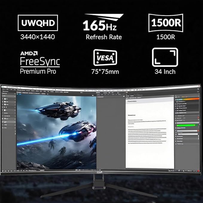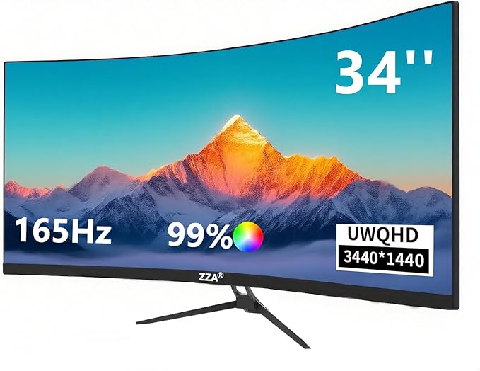 - Immersive Viewing Experience: The ZZA 34" UltraWide Curved UWQHD Monitor features a stunning 3440x1440 resolution, delivering an expansive view and crisp, detailed images that truly immerse you in every scene. With its 21:9 aspect ratio and curved display, this monitor provides a wider field of view, making it perfect for gaming, watching movies, or multitasking.