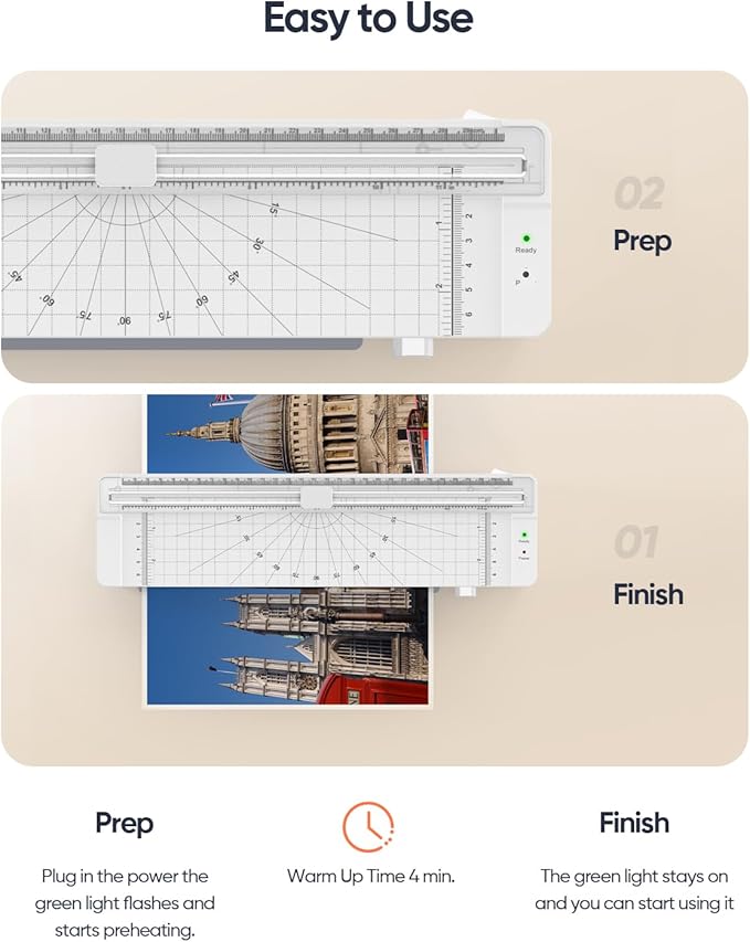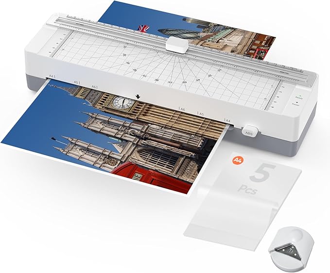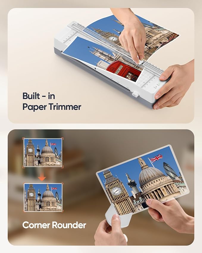 - 【3-in-1 Laminating Tool】 This all-in-one laminator machine includes a built-in paper trimmer and a corner rounder, giving you smooth edges and clean cuts without extra tools — perfect for crafts, documents, and school projects.