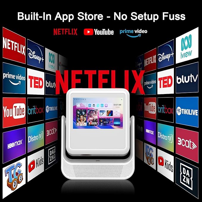 - 【Built-in Apps/ Ditch the Streaming Sticks】Compatible with Netflix, YouTube, and Prime Video, no additional devices are required. Bluetooth projector features a built-in “App Store,” allowing you to install all your favorite apps and access a vast library of popular films.Turn it on and access millions of movies, shows from around the world. This projector 4k will regularly update to ensure you have the latest features, enhancing application security and stability.