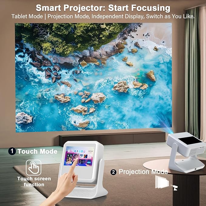 - 【8-Inch SmartTouch Command Center】Aepuesem smart touchscreen projector lets you ditch the remote forever! As the only projector with a built-in 8" touchscreen, it revolutionizes control: Swipe to browse content, tap to play/pause/fast-forward like a tablet, and access settings/weather/time in seconds. Switch effortlessly between Projection Mode and Tablet Mode (screen turns off in Projection Mode). That's why 96% of users say it's a good choice after purchasing it.