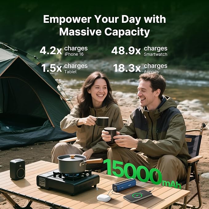 - Adventure Ready with Massive Power: With a 15,000mAh capacity and four versatile charging options—two USB-C ports, one USB-A, and a wireless port for Apple Watch (S3–S8)—this power bank keeps all your gear powered up. Whether you're off the grid or deep in the backcountry, fast output lets you charge multiple devices at once, so you're always ready for the next leg of the journey.