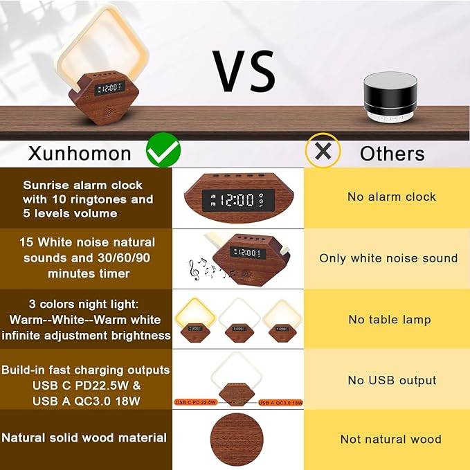 - Smart Alarm Clock with Charger: This Xunhomon alarm clock table lamp equips with USB-A QC 3.0 18W & PD 22.5W USB C fast charger for 2 devices fast charging at the same time,compatible with iPhone,Samsung,google,iPad,tablet,power bank,kindle,smart watch and more—Say goodbye to cluttered chargers