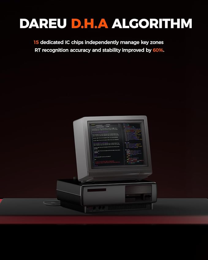 - D.H.A.Algorithm:Driven by our self-developed DAREU Hyper Algorithm (D.H.A.), fine-tuned over tens of thousands of tests for tournament-grade speed and rock-solid stability. 15 dedicated IC chips independently manage key zones, doubling control efficiency and boosting stability by 60% for flawless inputs during intense gameplay.