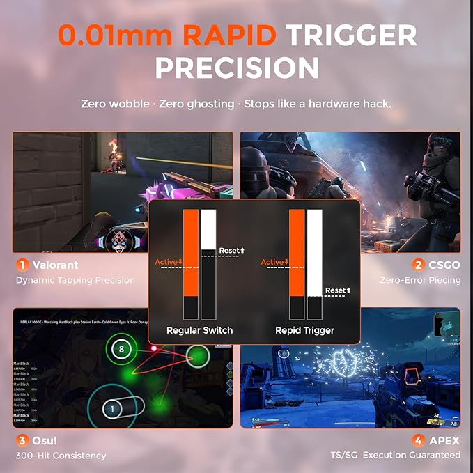 - 0.01mm Rapid Trigger Gaming Keyboard: Supports ultra-low RT step distance of just 0.01mm for instantaneous keystroke registration, ideal for complex combos. Adjust the actuation point (0.2mm-3.5mm) and fine-tune the press/reset sensitivity via software to perfectly match your playstyle.