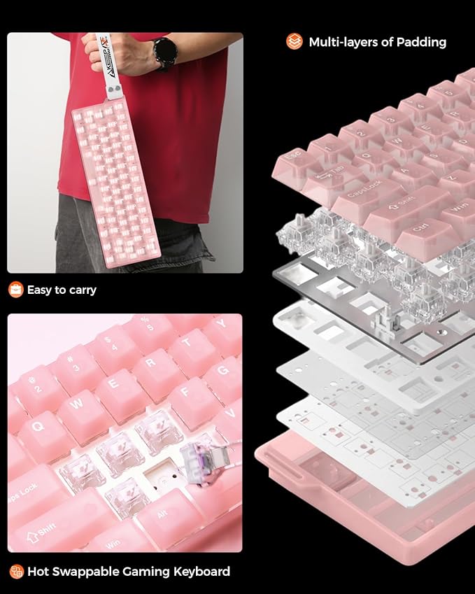 - 60% Compact Wired Keyboard: Engineered for competitive gamers, this 60% gaming keyboard dramatically frees up to 40% of your desk space for optimal mouse control and a cleaner setup, all without sacrificing essential functionality – intuitive FN key combinations unlock every command you need. Its ultra-lightweight, minimalist design effortlessly fits into any backpack or laptop bag, making it the ultimate portable solution for LAN parties, travel, or minimalist setups.