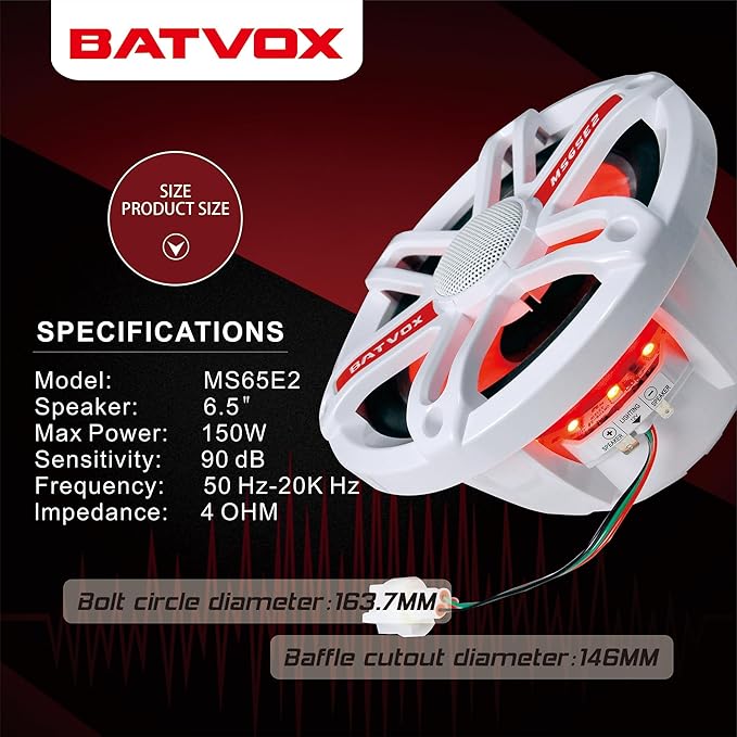 MS65E2 6.5 Inch Marine Speakers with 7-Color LED Lights,2 Way IP67 Waterproof and Weather Resistant Outdoor Stereo Sound System with 300 Watt Max, White (2 Speakers)
