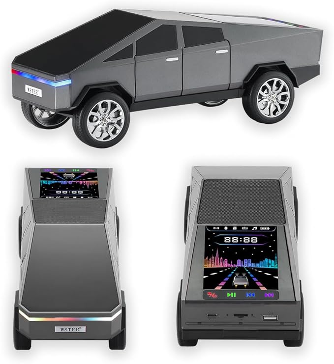- 🚀 Futuristic Truck Design + Display Screen Inspired by modern electric trucks, this eye-catching speaker features a dynamic display that enhances both looks and usability.