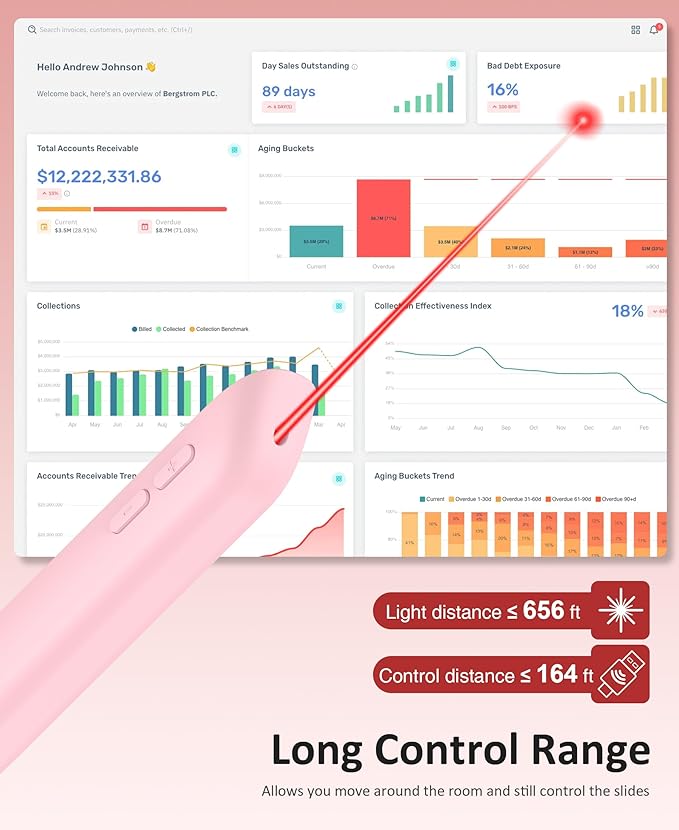 - 【Rechargeable Presenter Remote & Low Battery Reminder】PPT remote clicker allowing it to be recharged with the provided USB C cable anytime,full charge takes 1.5 hours, can be used for 7 days, standby for 30 days ensuring that the laptop clicker is always in use.The pink presentation with a low power indicator reminds you charge it in time.The blue light flashes once every second, indicating that the battery level is low and needs to be charged in a timely manner