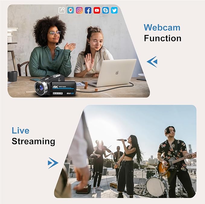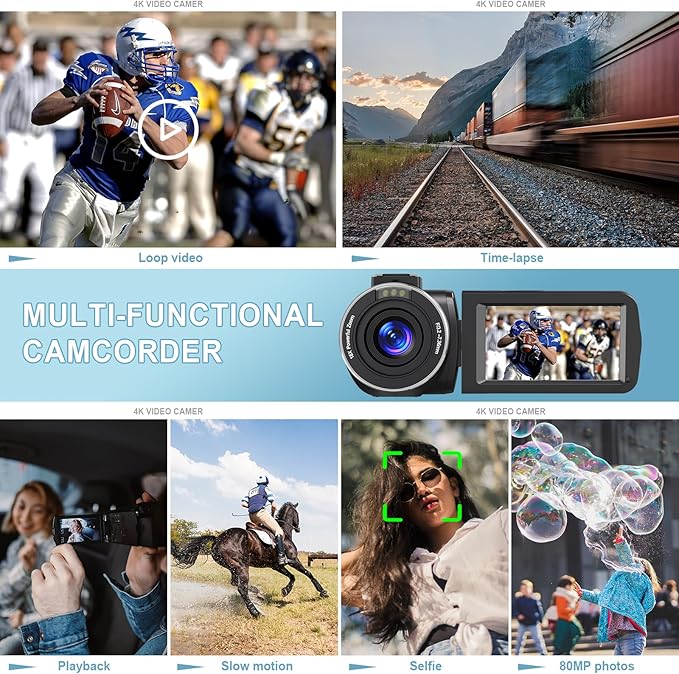 - 【Ultra HD 4K 80MP video camera】This 4K video camera offers an HD resolution of 4K (30 FPS) and an 80MP high pixel lens.Whether you're filming a happy family reunion or your children's childhood moments with this HD camcorder, you can capture everything precisely.Thanks to the 18X digital zoom, you can zoom in on distant subjects effortlessly. This video camera is ideal for videography beginners. Its compact design and weight of less than 500g make it easy to handle.