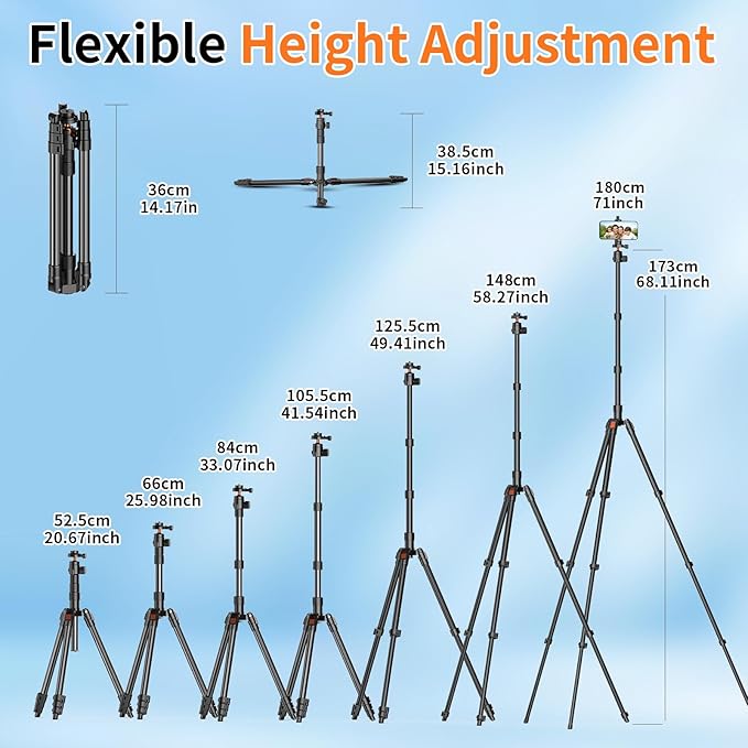 - 【71" Extendable Camera Tripod】Extends to 68.11 inches by flip locks of the leg tube and rotation locks of the center column (With phone clip is 71inch height ), this camera phone tripod fully adapts to a range of different heights after locked and the center column is equipped with one bubble level, meeting your options for various accurate photography needs.