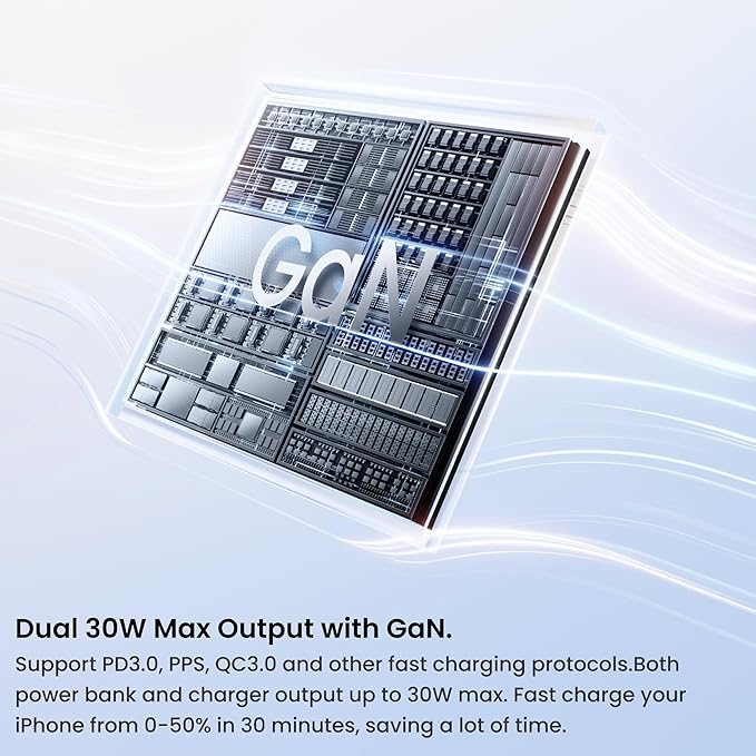 - Dual 30W Max Output with GaN: Both power bank and charger output up to 30W max. Fast charge your iPhone from 0-50% in 30 minutes, saving a lot of time